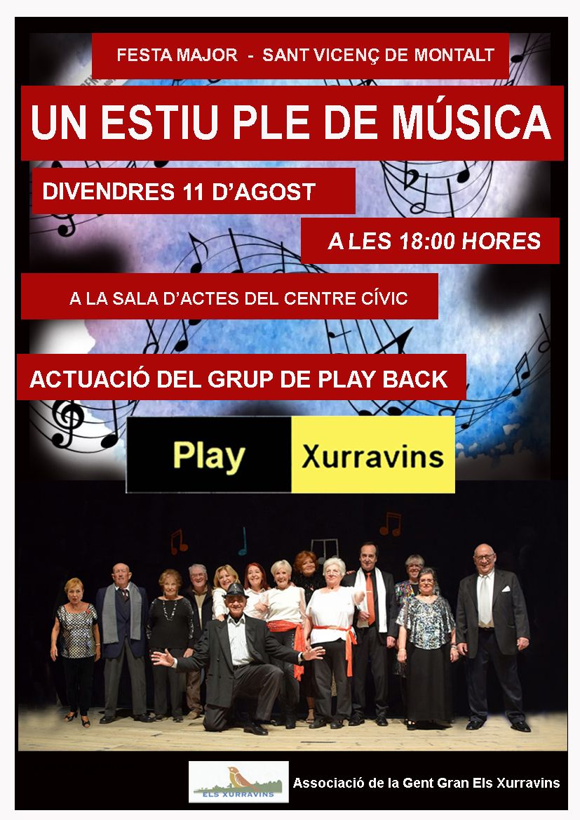 VÍDEO DE L’ESPECTACLE UN ESTIU PLE DE MÚSICA OFERT PEL GRUP PLAY XURRAVINS – divendres 15 d’agost a la sala d’actes del centre cívic de sant Vicenç.