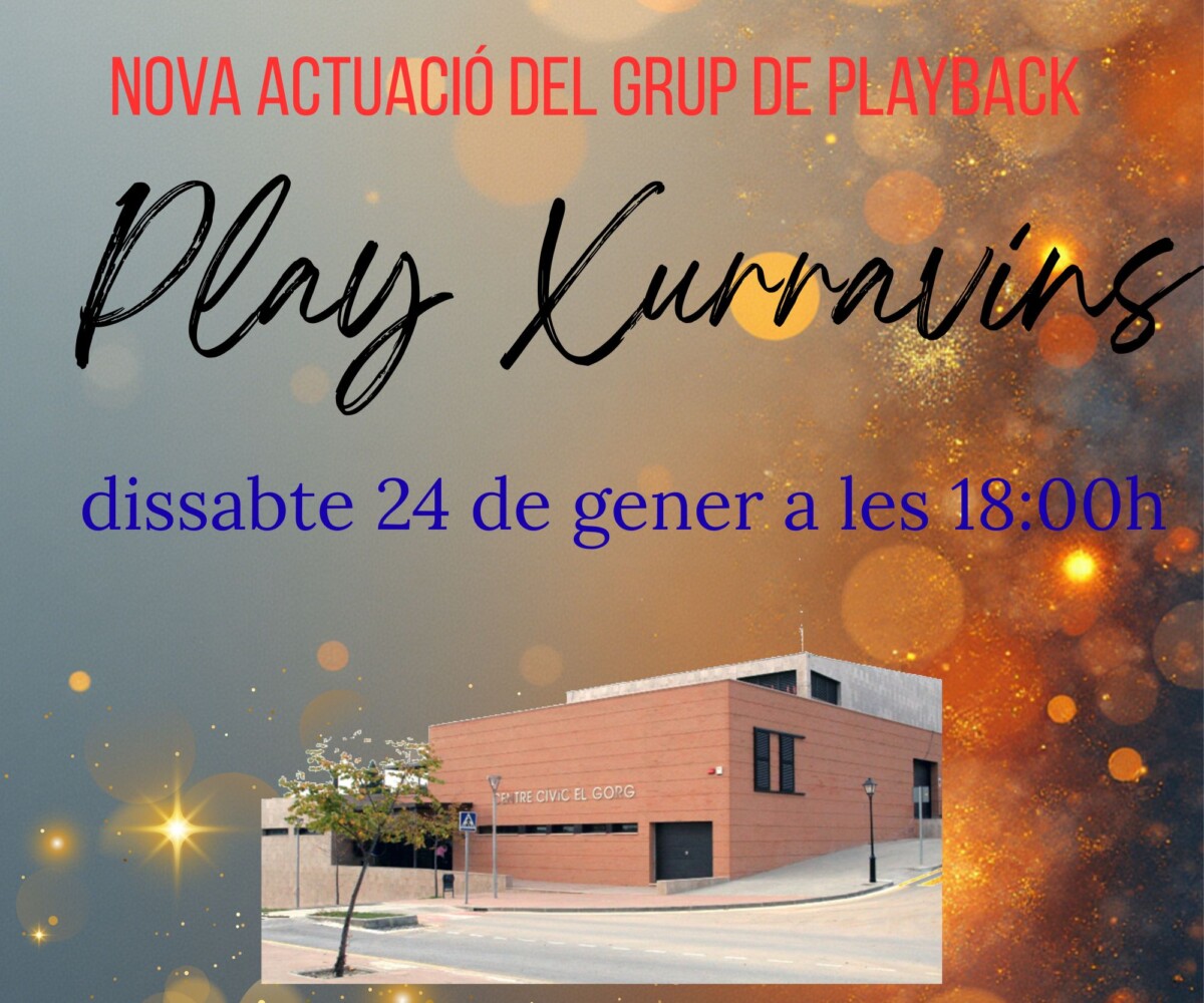 El grup de playback Play Xurravins oferirà una nova de les seves actuacions al teatre del centre cívic. Això tindrà lloc el dissabte 24 de gener a les 18:00h. Repertori de cançons sempre nou. Incorporació de nous interprets.