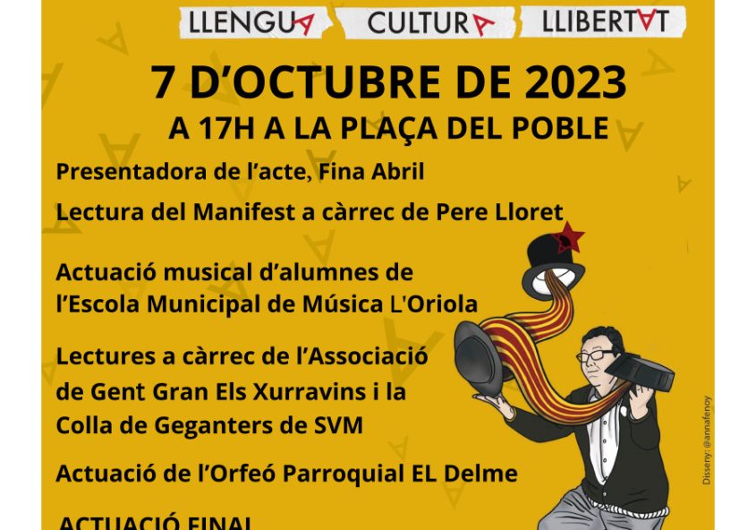 Presenta l’acte: Fina Abril Lectura Manifest : Pere Lloret Actuació: Alumnes Escola Municipal de Música L’Oriola Lectures: a càrrec de L’associació de Gent Gran Els Xurravins i la Colla de Geganters de…