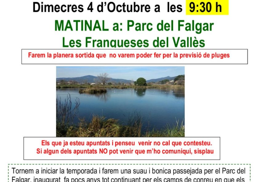 3 de setembre de 2023CAMINAR SALUDABLE – PARC DEL FALGAR, LES FRANQUESES DEL VALLÈS – Dimecres 4 d’octubre a les 9:30h