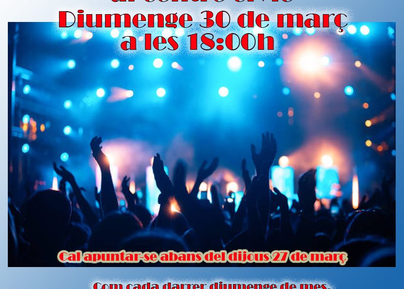 Com cada darrer diumenge de mes, vine a la sala d’actes del centre cívic a gaudir de la música, l’amistat prenent una copa de cava i uns pastissos. T’hi esperem!!!